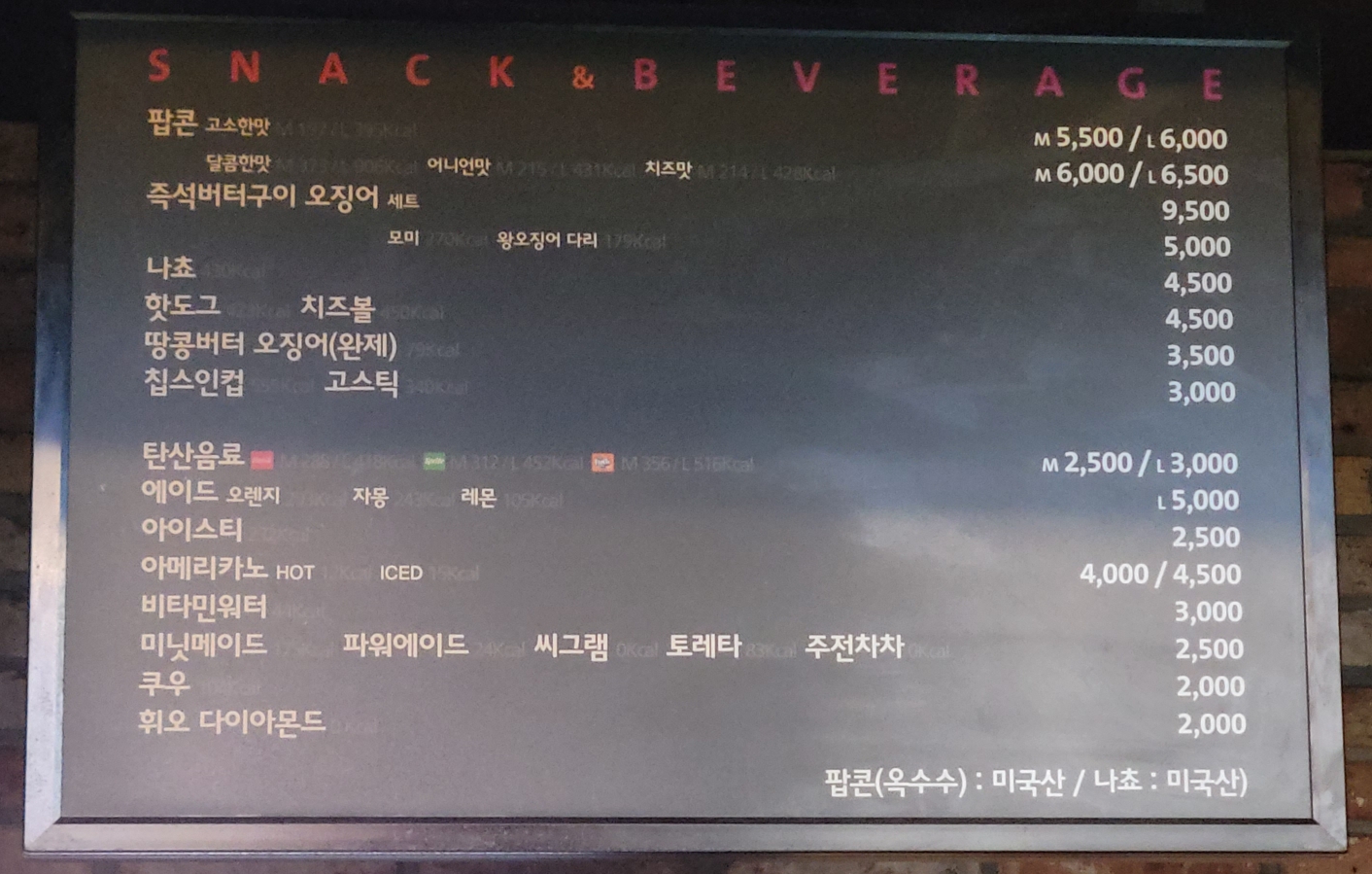 이천 CGV의 팝콘매점 단품 메뉴