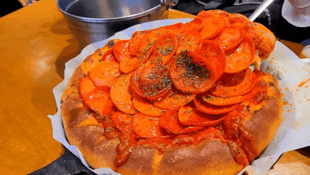 한번 굽고 컷팅하고 페퍼로니를 올려서 한번 더 굽는 것 같았어요.